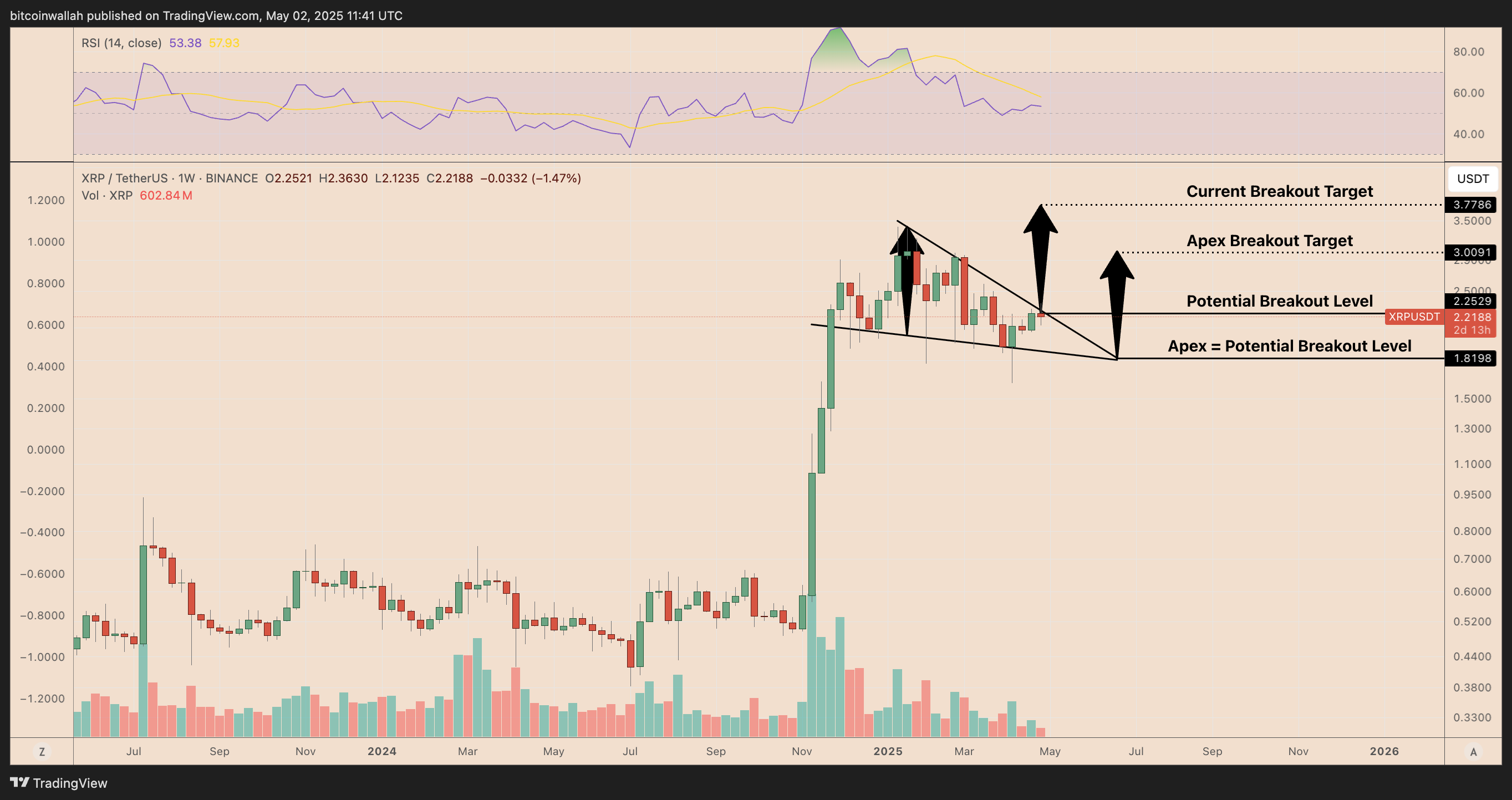 If XRP breaks this level, the pattern’s measured move — calculated from the wedge’s maximum height — suggests a potential rally toward $3.78 by June. This would represent an estimated 70% upside from the current prices.