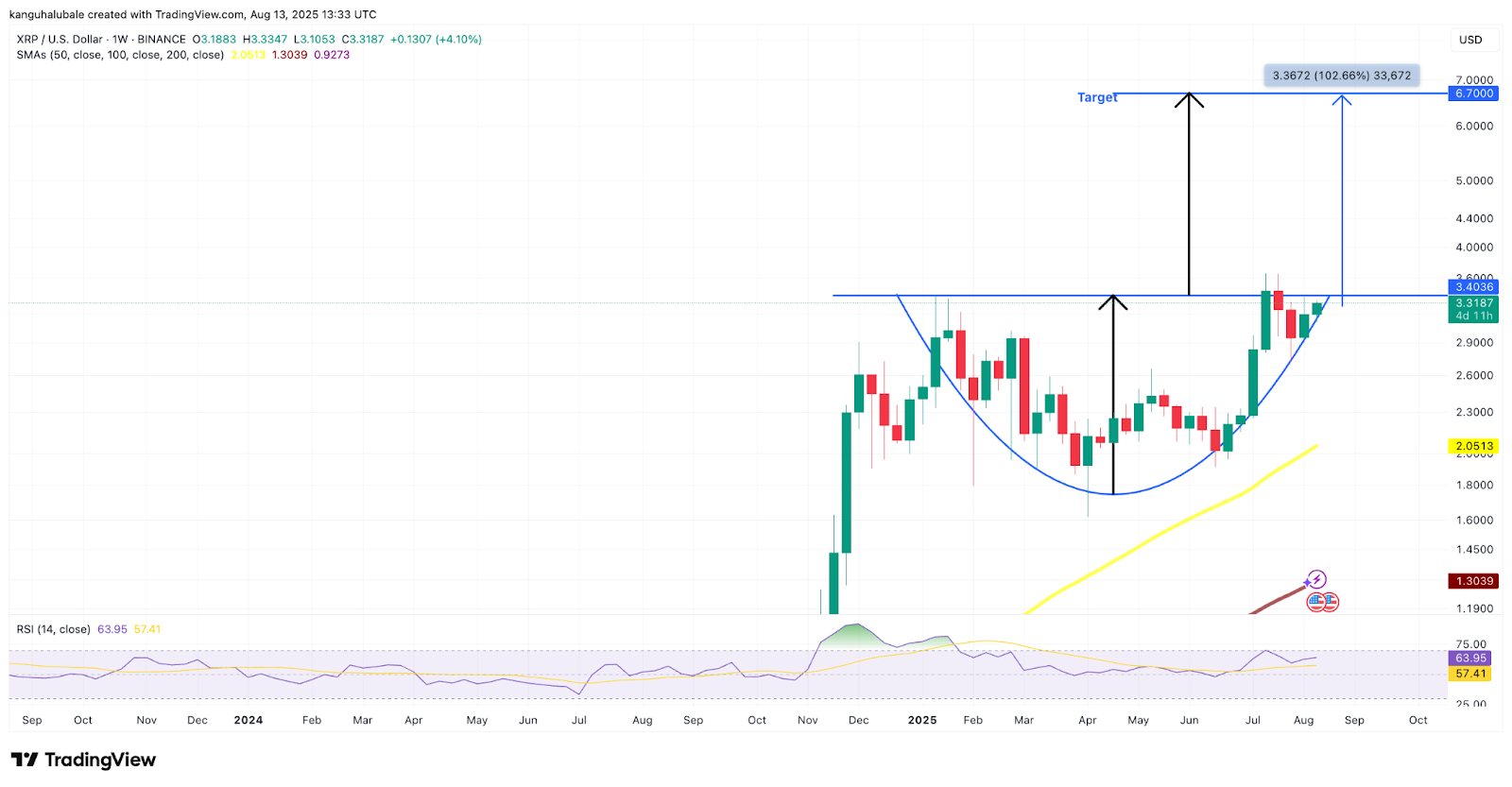 Zooming out, XRP’s price has formed a rounded bottom chart pattern on the weekly chart (see below). Bulls are now focused on pushing above the chart pattern’s neckline at $3.40.