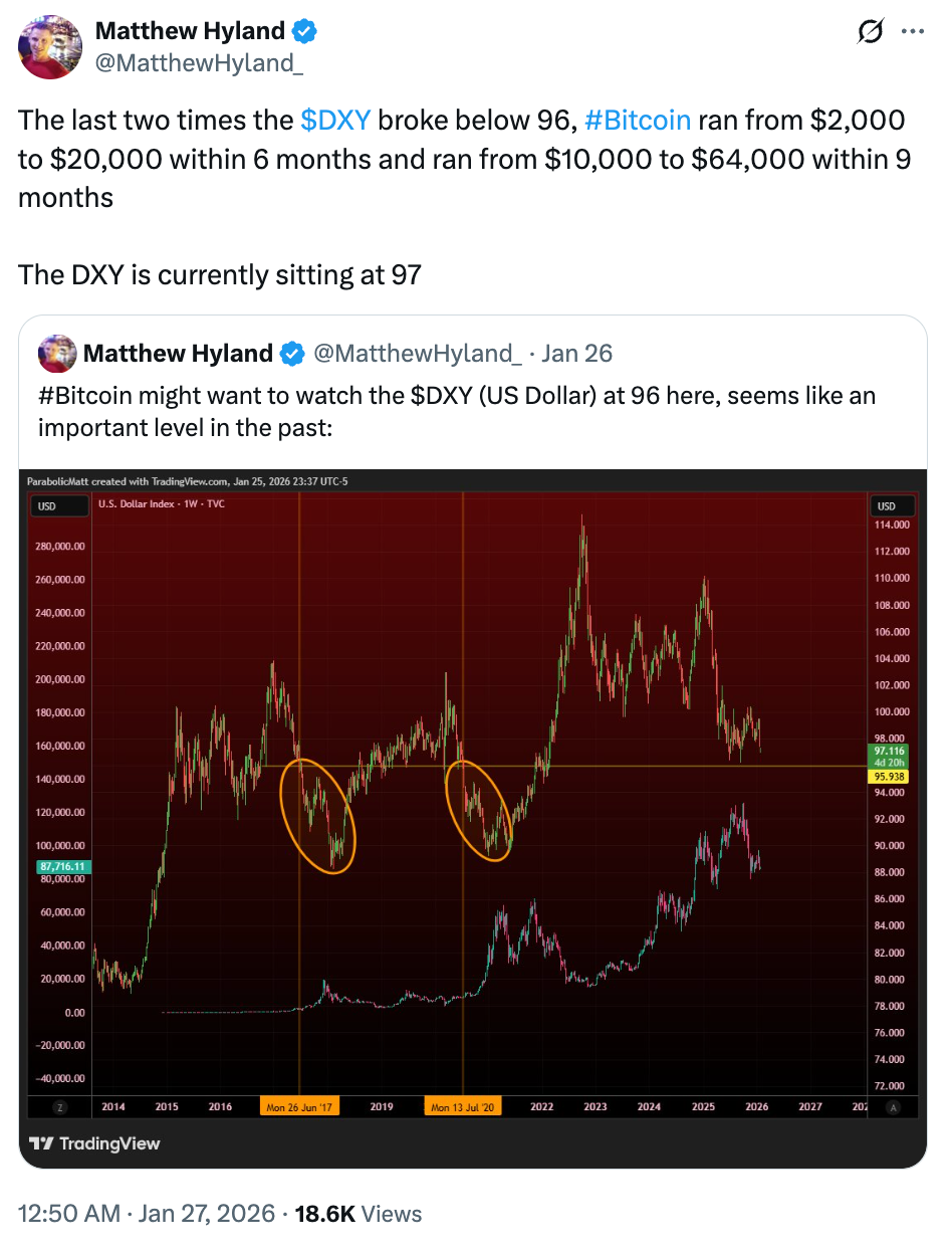 Fellow analyst Matthew Hyland also foresees a possible BTC price breakout, based on the performance of the US dollar strength index (DXY).