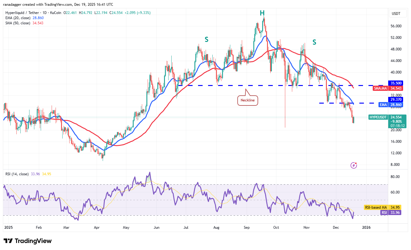 The relief rally could reach the 20-day EMA ($28.86), which is a crucial overhead resistance to watch out for. If the price turns down sharply from the 20-day EMA, it indicates that the bears continue to sell on rallies. That increases the risk of a break below the $20.82 support. If that happens, the HYPE/USDT pair could plummet to $16.90.