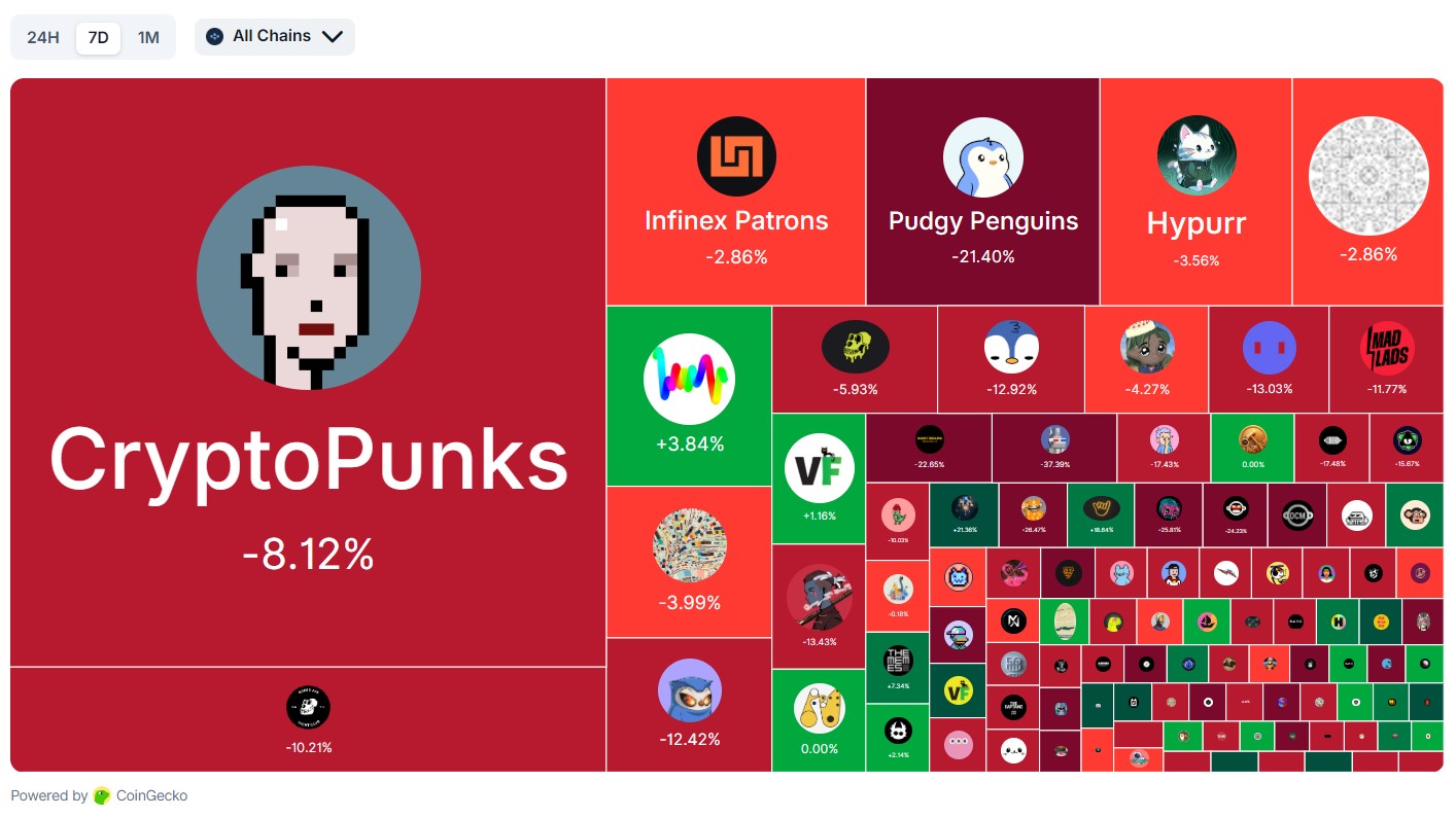 CryptoPunks, the top NFT collection by market capitalization, is down by 8% on the weekly charts and nearly 5% on the 30-day NFT performance chart.