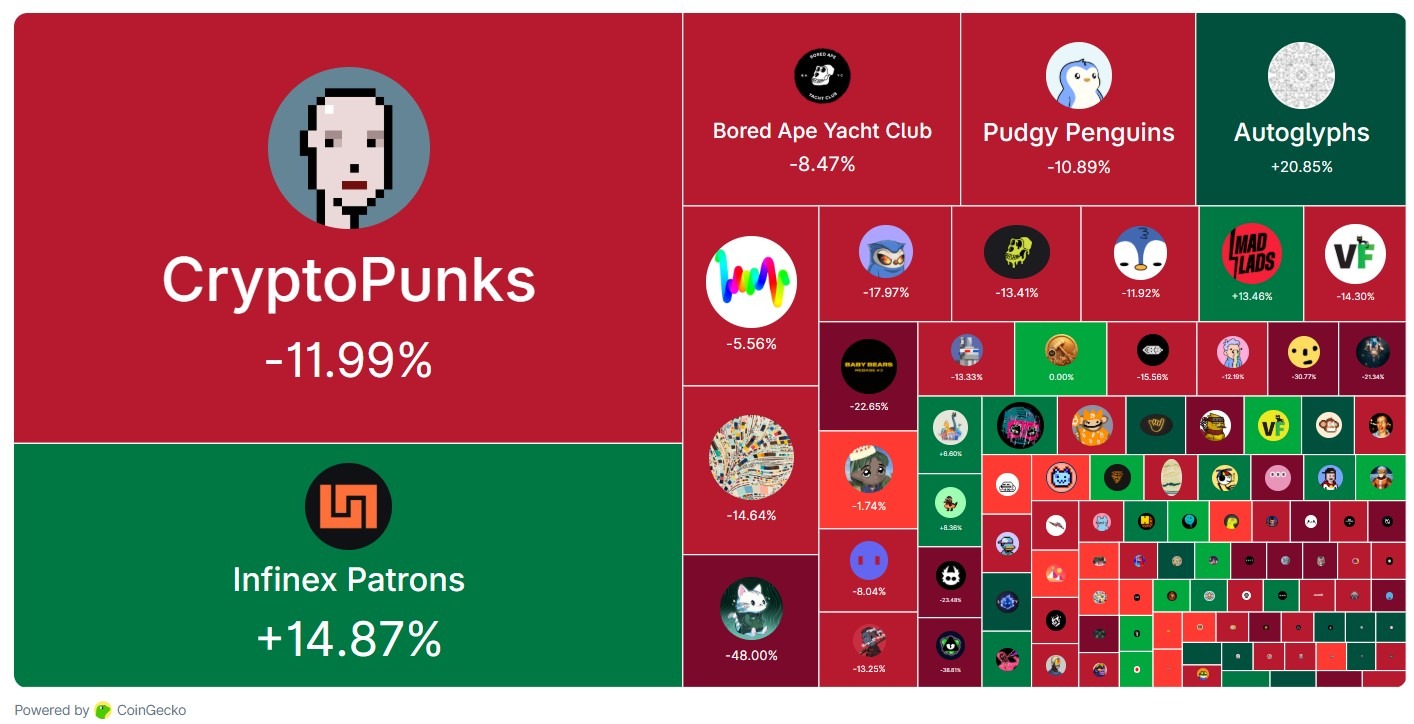 CoinGecko data showed that most of the top NFT collections mirrored the broader market decline, with CryptoPunks, the largest by market cap, falling 12% in the last 30 days.