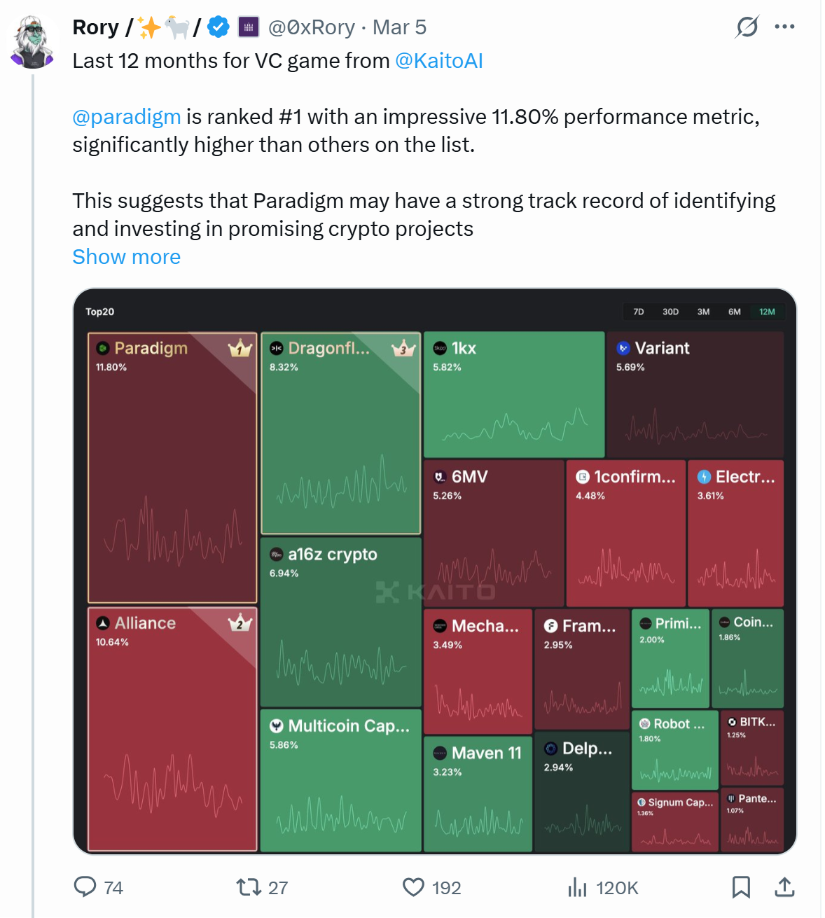 In March, Web3 data platform Kaito AI ranked Paradigm as the top-performing crypto VC over the past year, posting an impressive 11.80% performance metric, outperforming other major players like Alliance (10.64%), Dragonfly (8.32%), a16z (6.94%) and Multicoin Capital (5.86%).