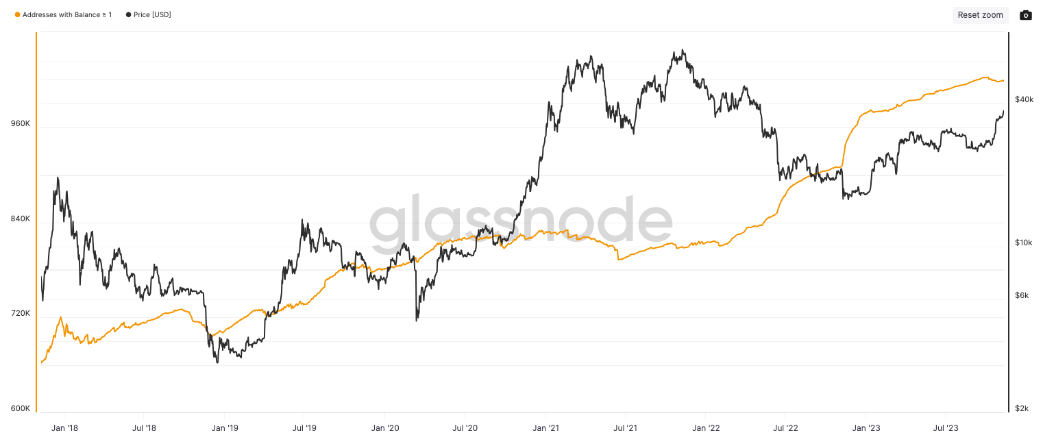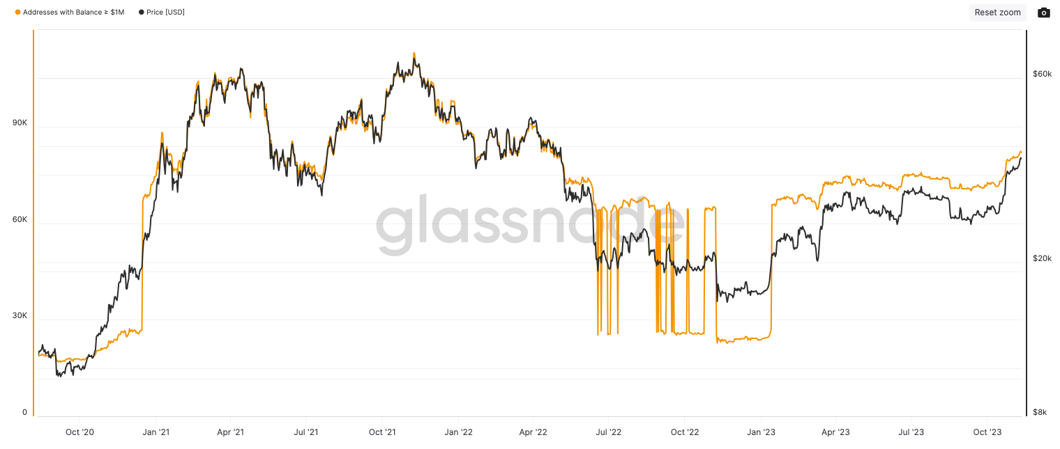 BitInfoCharts data shows the number of addresses with more than $1 million in BTC increased from 23,795 on Jan. 1 to 81,925 currently, a 237% increase in the last 11 months.