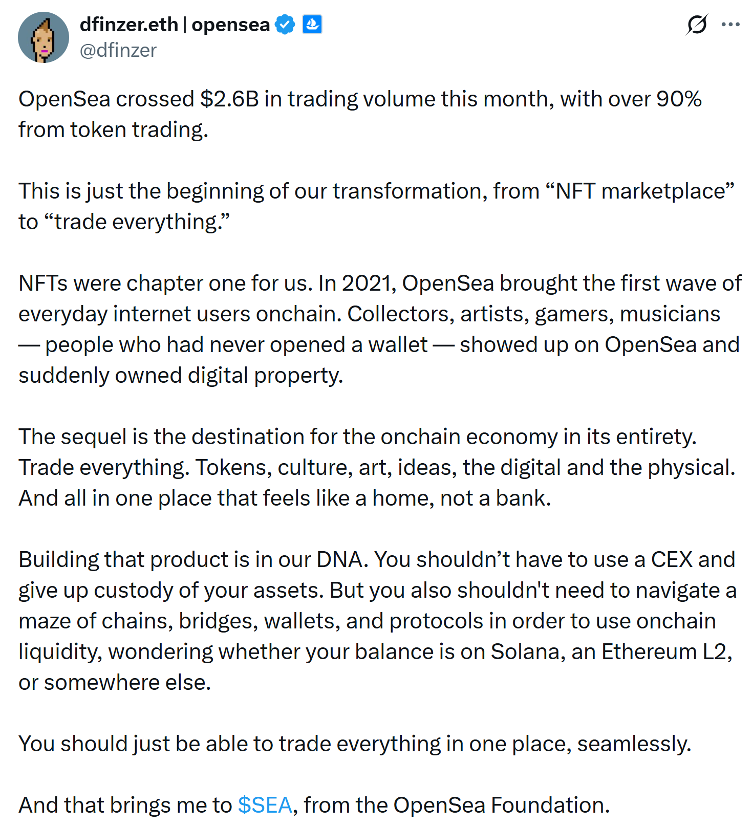 Additionally, the OpenSea Foundation will launch its SEA token in the first quarter of 2026, which will support governance and ecosystem participation.