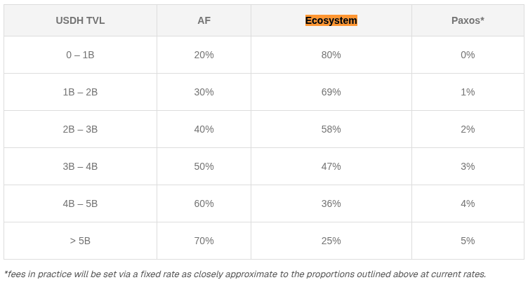 After reaching $1 billion in TVL, Paxos starts earning 1% of the fees, and this percentage continues to scale up until it reaches 5% at a TVL of $5 billion or greater. In the initial phases, up to 80% of the funds are spent on ecosystem development, but as the TVL increases, this percentage decreases to 25%, as more money is allocated to Hyperledger’s Assistance Fund treasury.