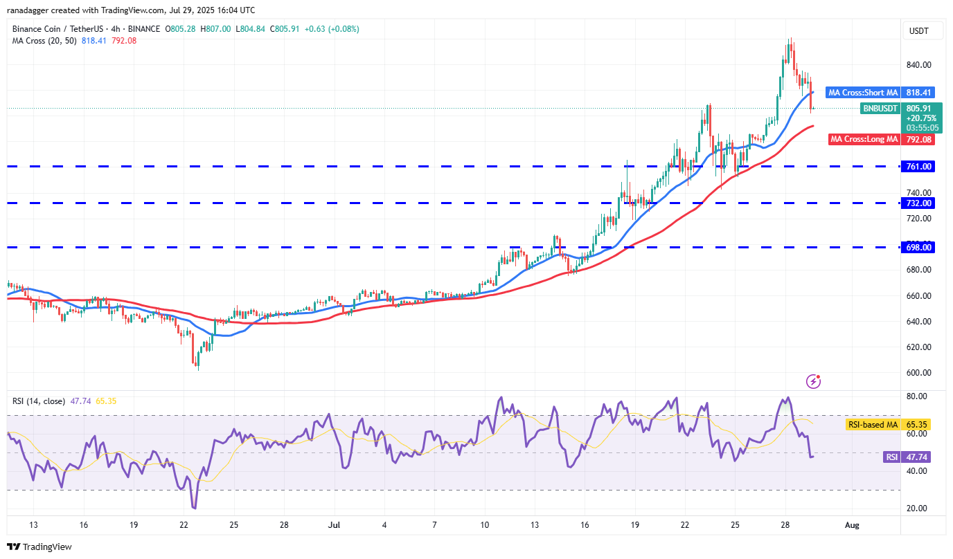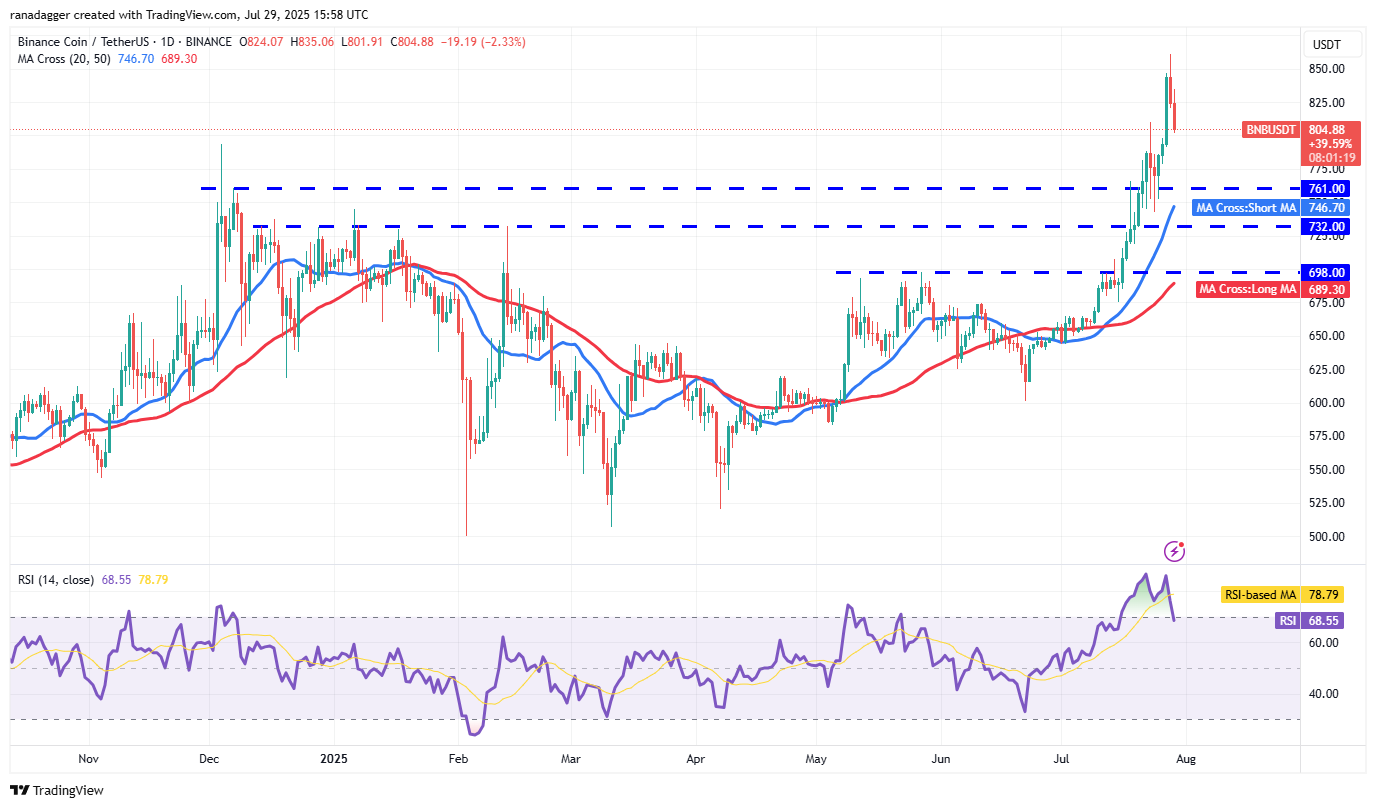 BNB (BNB) pulled back from $861 on Monday, indicating profit booking by the short-term buyers.