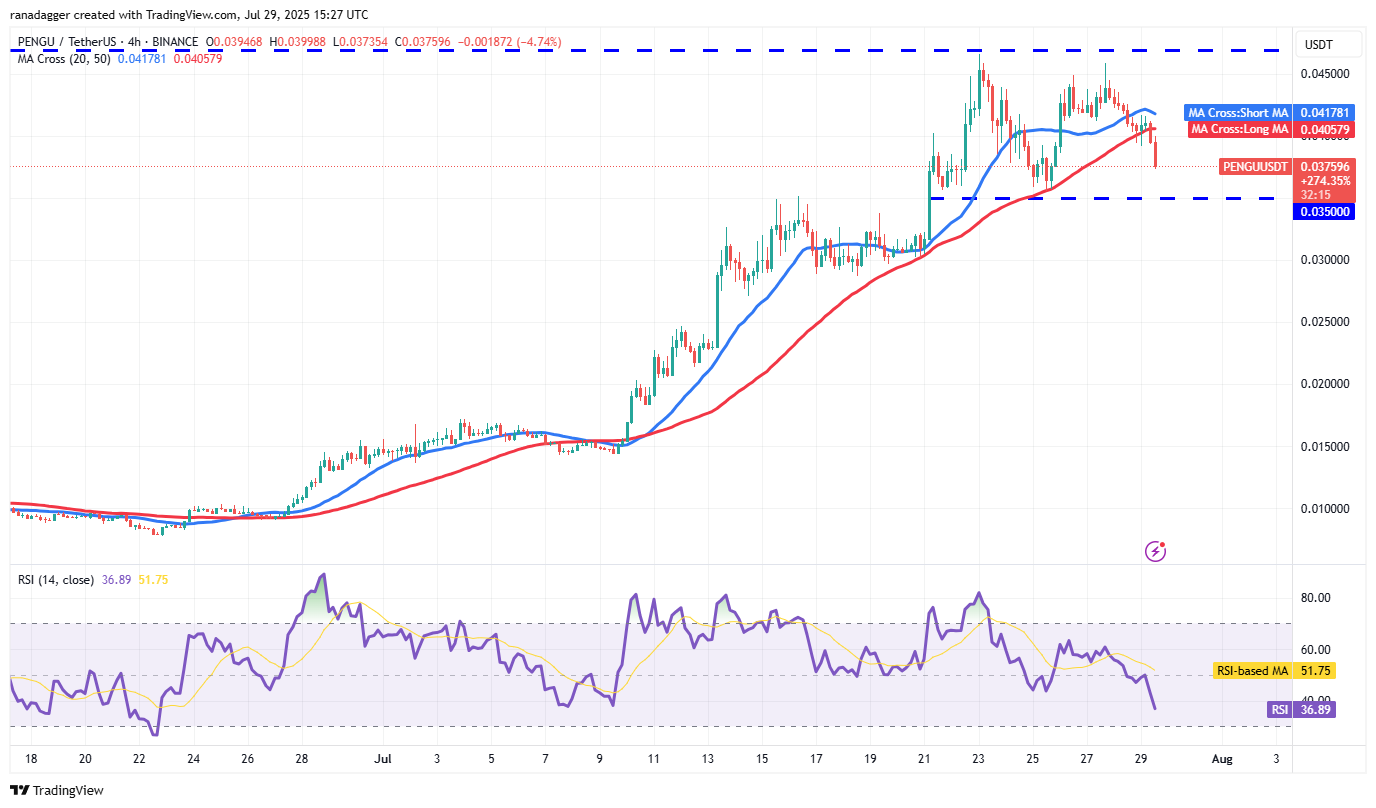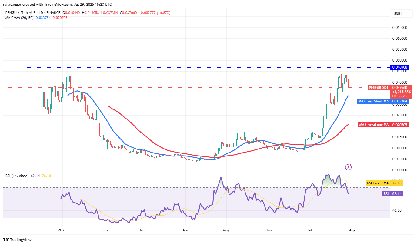 The upsloping moving averages and the RSI in the positive territory suggest that buyers have the edge. If buyers drive the price above $0.046, the PENGU/USDT pair could start the next leg of the up move to $0.054 and later to $0.065.