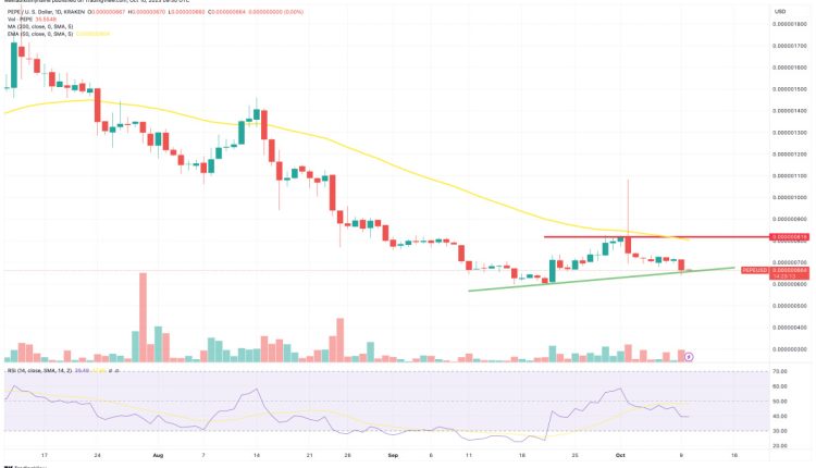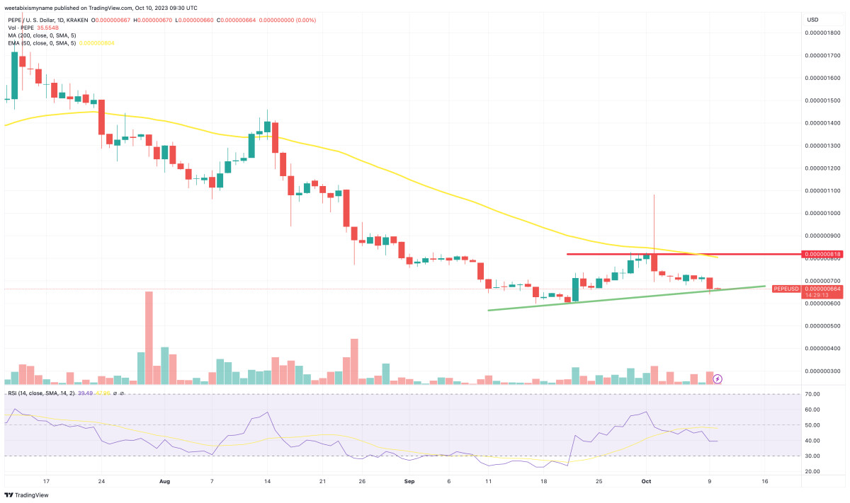 This means that PEPE is due a rebound (at least on a purely technical basis), with the coin’s modestly rising support level (green) also suggesting that it has finished dropping for now.
