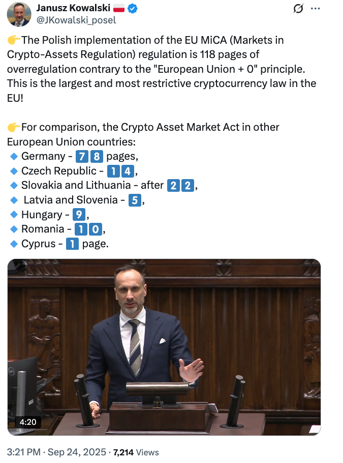 “This is the largest and most restrictive cryptocurrency law in the EU,” Kowalski wrote on X after the bill passed its second reading last Wednesday.