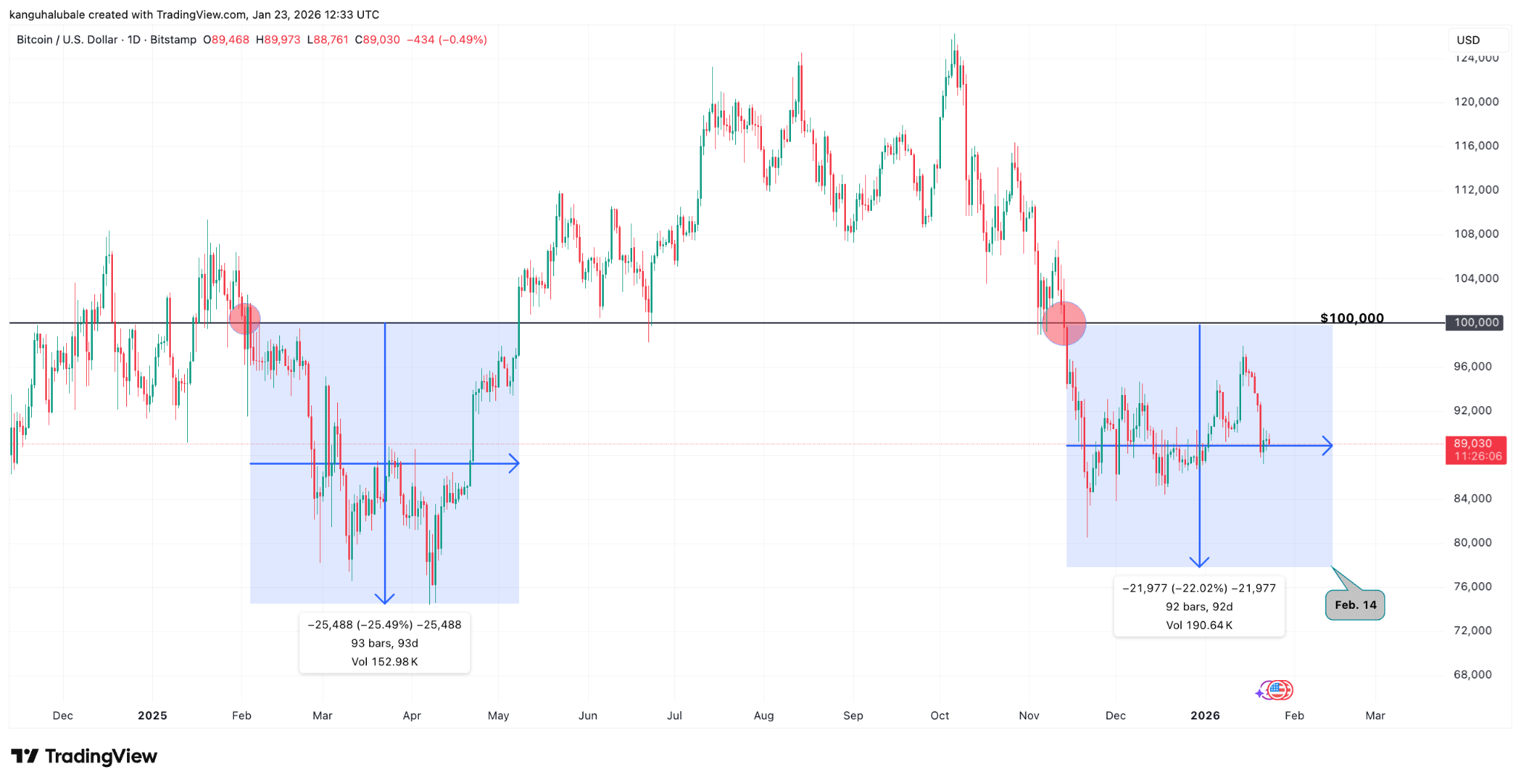 The last time BTC/USD dropped below $100,000, it reclaimed the level after 93 days following a 25.5% drawdown.