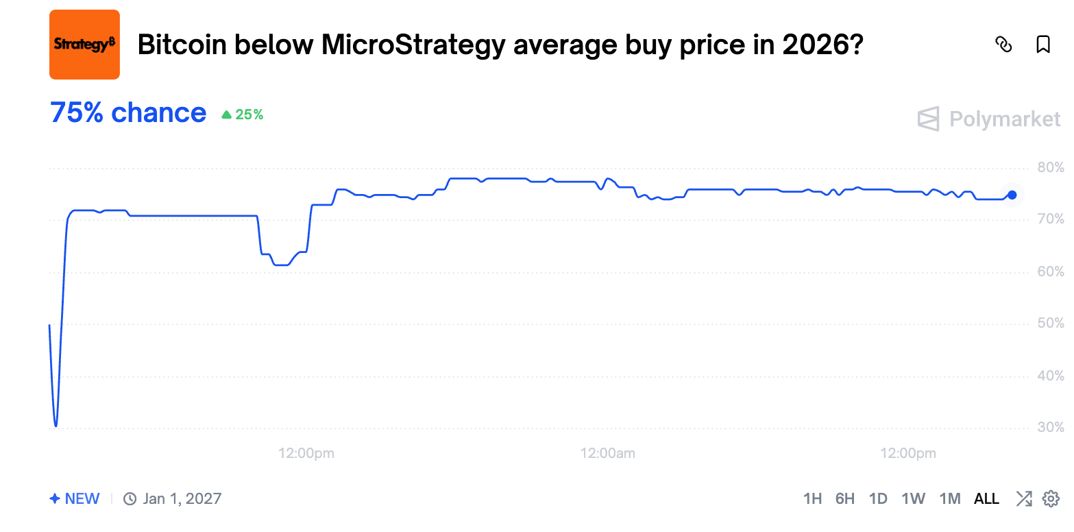 Traders on Polymarket set a 75% chance that Bitcoin will trade below Strategy’s average BTC cost price in 2026, which is $75,979  at the time of writing.