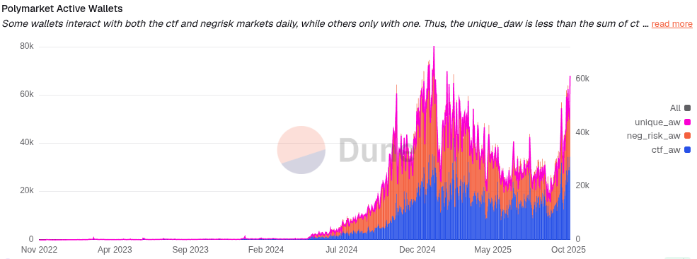Polymarket grew in notoriety in late 2024, as its market during the United States presidential elections attracted significant attention and capital. The service reached its highest-ever number of daily active wallets at the beginning of 2025 — over 72,600 on Jan. 19, Dune data shows.