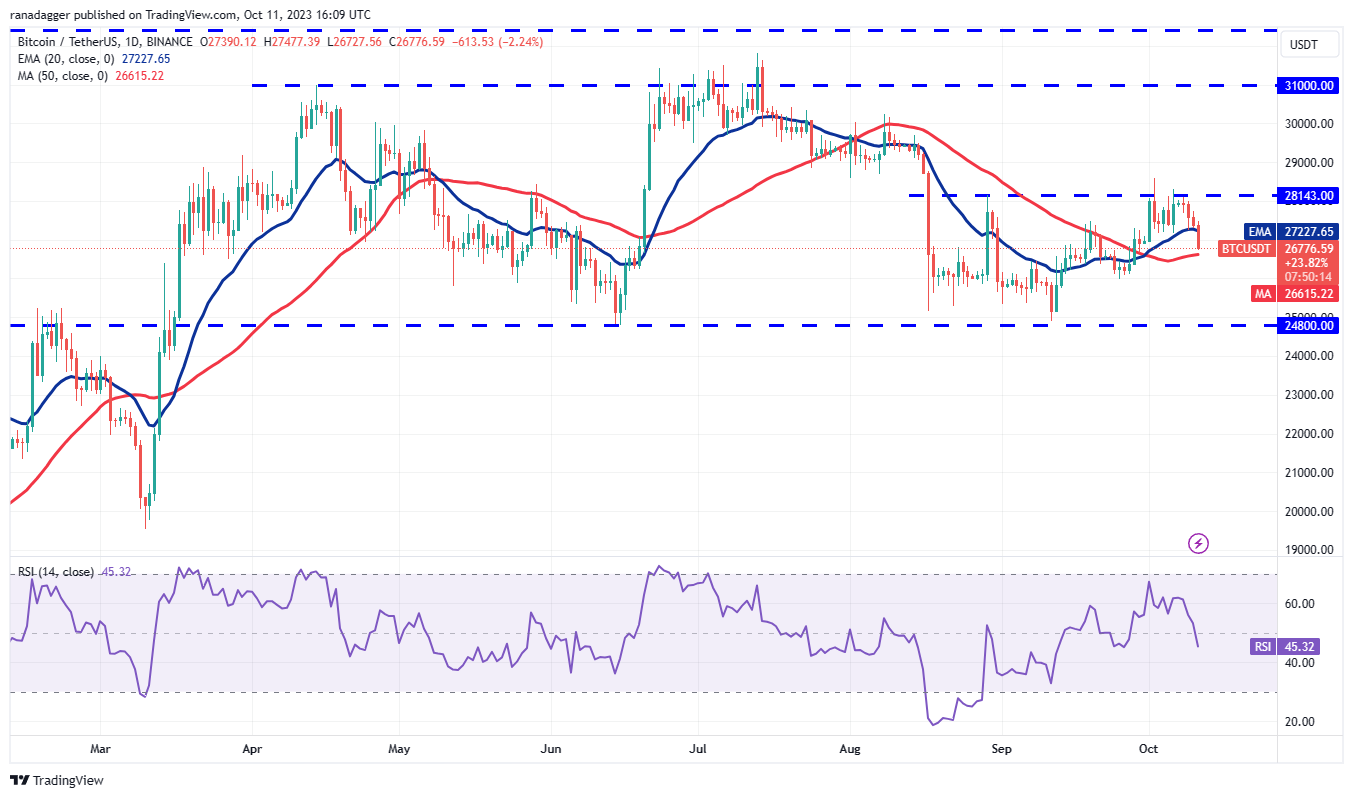 After finding support at the 20-day exponential moving average ($27,227) for the past two days, Bitcoin broke below the level on Oct. 11. This shows that the bears are trying to seize control.