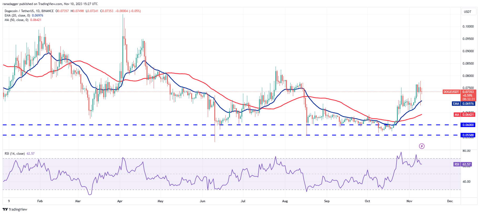 Dogecoin (DOGE) swung wildly on Nov. 9, as seen from the long wick and tail on the candlestick. This suggests indecision among the bulls and the bears.