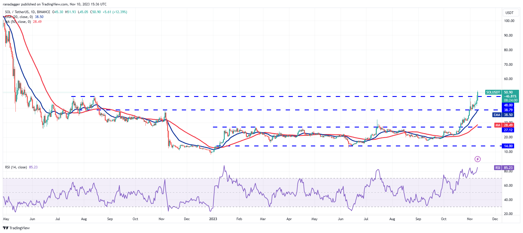 Solana (SOL) nudged above the overhead resistance of $48 on Nov. 9 and followed that up with a sharp move above the overhead resistance on Nov. 10.