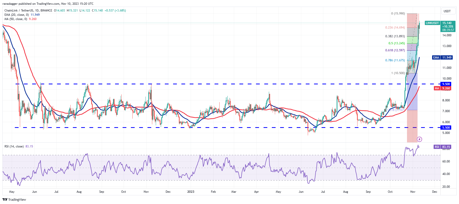Chainlink (LINK) reached $15 on Nov. 8, and the bulls tried to extend the rally on Nov. 9 but the long wick on the candlestick shows selling at higher levels.