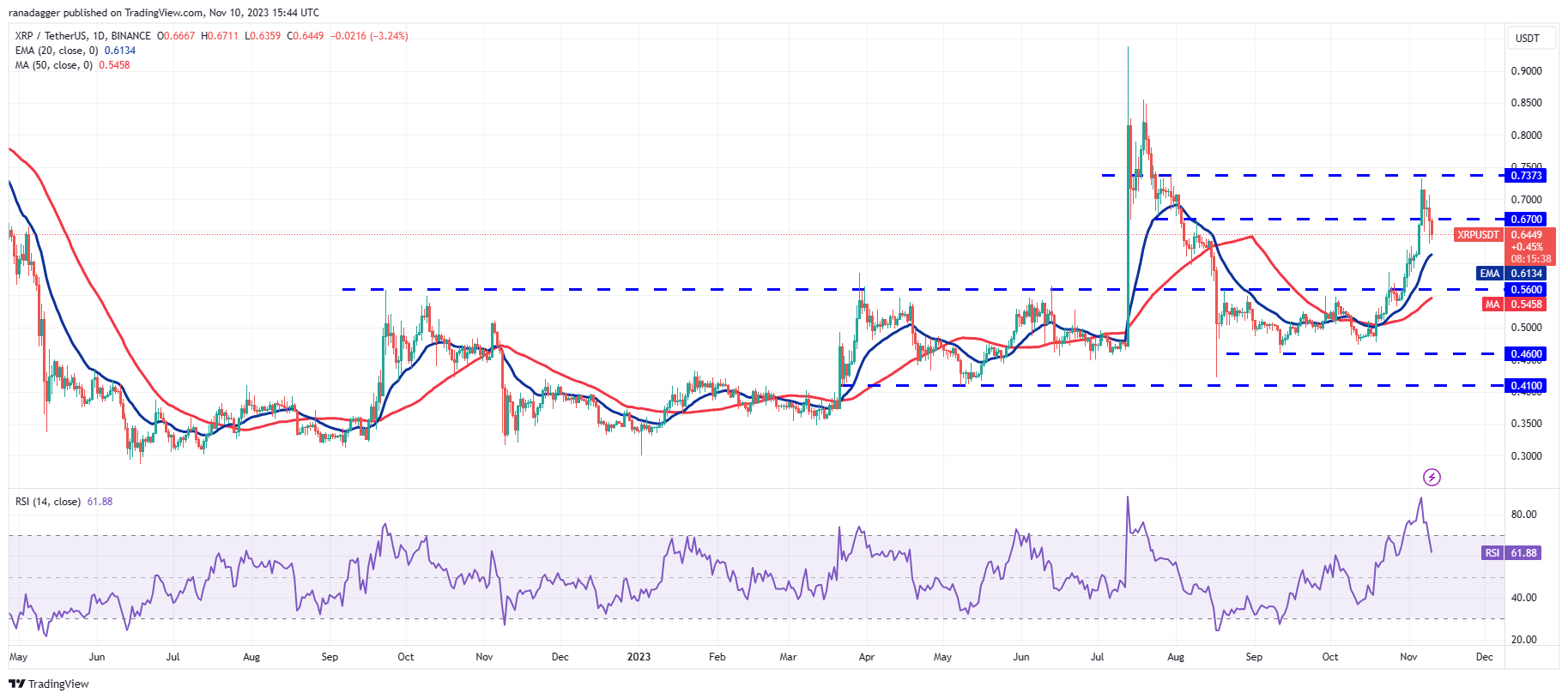 XRP (XRP) turned down from $0.74 on Nov. 6 and broke below the immediate support at $0.67 on Nov. 9. This suggests profit-booking by the bulls.