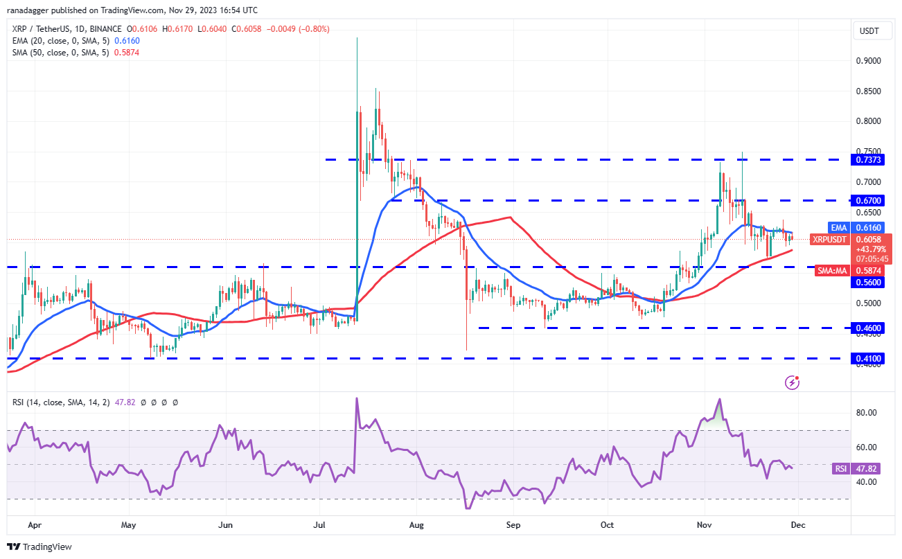 If buyers kick the price above the 20-day EMA, the XRP/USDT pair may rise to $0.67. Instead, if the price turns down sharply from the 20-day EMA and skids below the 50-day SMA ($0.58), it will signal that bears are trying to seize control. The selling could accelerate further if the pair plunges below $0.56.