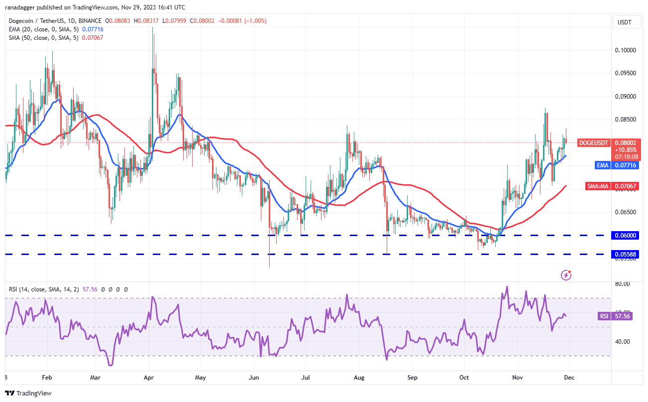 Dogecoin (DOGE) has been repeatedly taking support at the 20-day EMA ($0.08), indicating that lower levels are being purchased.