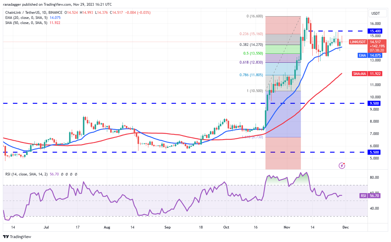 Chainlink (LINK) again found support at the 20-day EMA ($14.07) on Nov. 28, indicating that the bulls are vigorously guarding this level.
