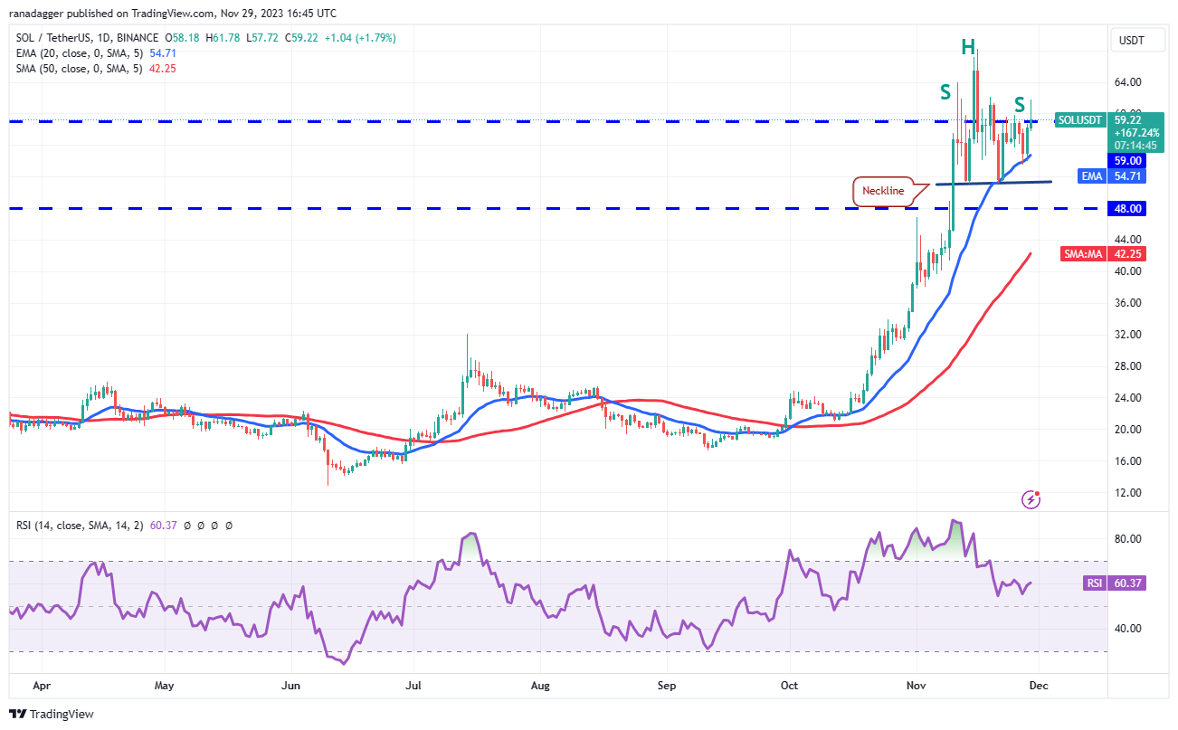 Solana (SOL) snapped back from the 20-day EMA ($54.71) on Nov. 28, indicating that the sentiment remains positive.