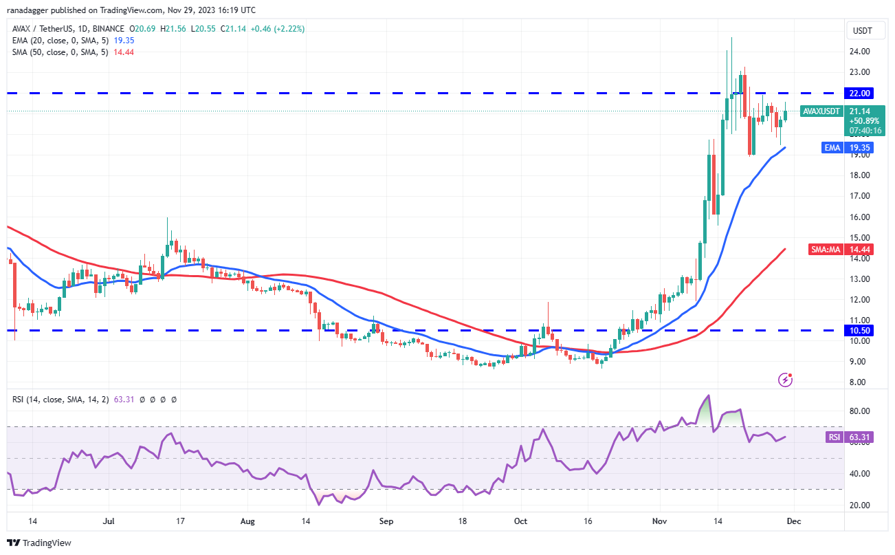 Avalanche (AVAX) rebounded off the 20-day EMA ($19.35) on Nov. 28, indicating that the sentiment remains positive and traders are buying on dips.