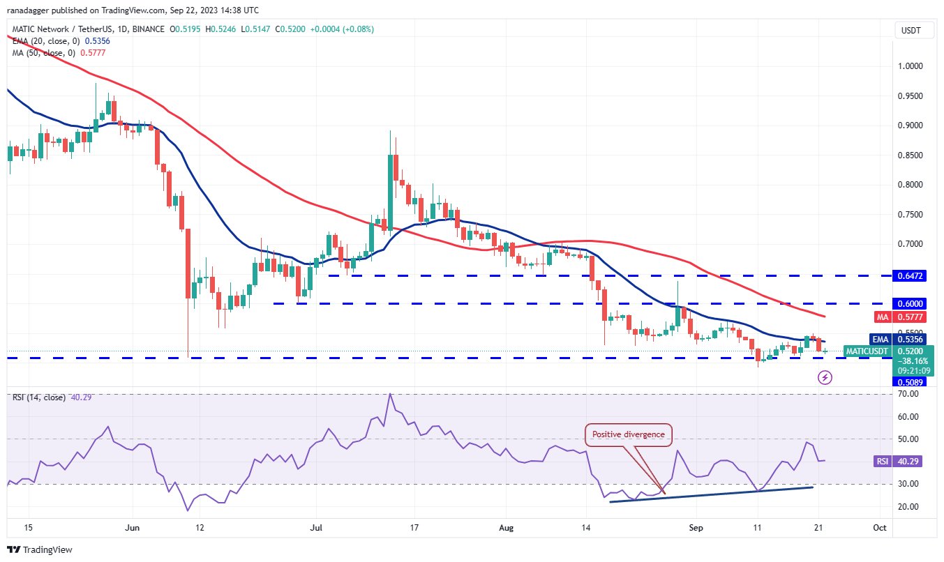 Polygon (MATIC) closed above the 20-day EMA ($0.54) on Sep. 19 but the bulls failed to build upon the momentum. This suggests that demand dries up at higher levels.