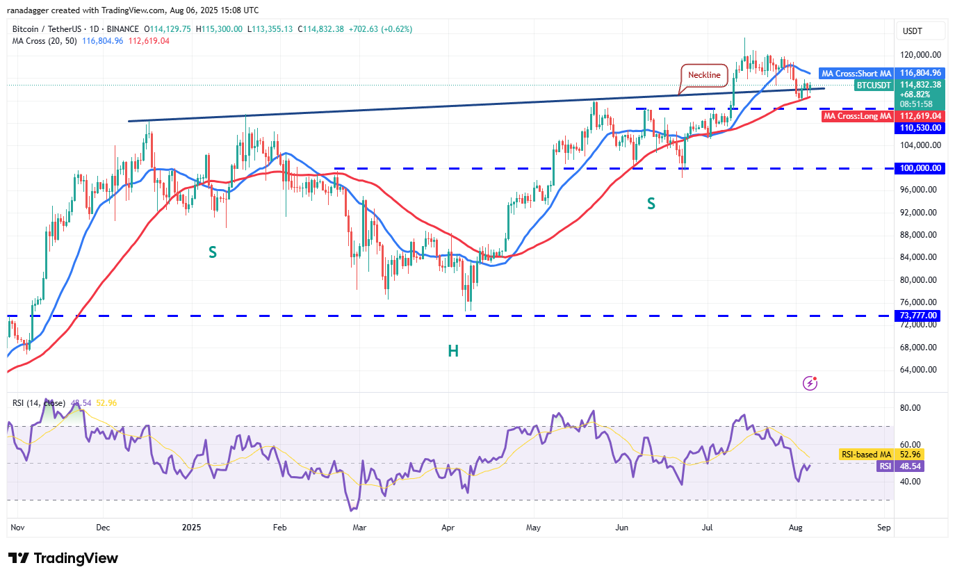 On Tuesday, BTC bounced off the 50-day simple moving average ($112,619), indicating that the bulls are vigorously defending the level.