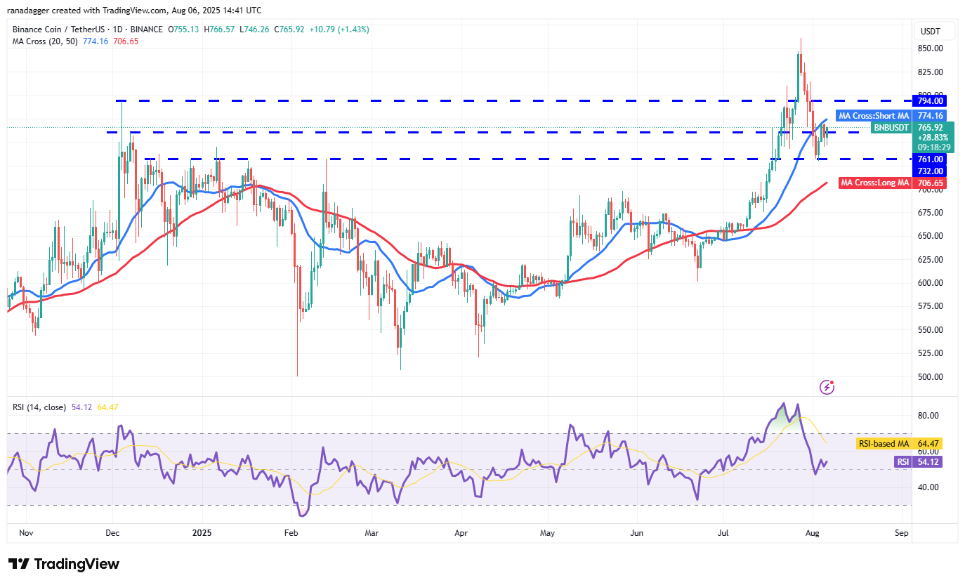 BNB’s (BNB) relief rally is facing selling at the 20-day SMA ($774), but a positive sign is that the bulls have kept up the pressure.