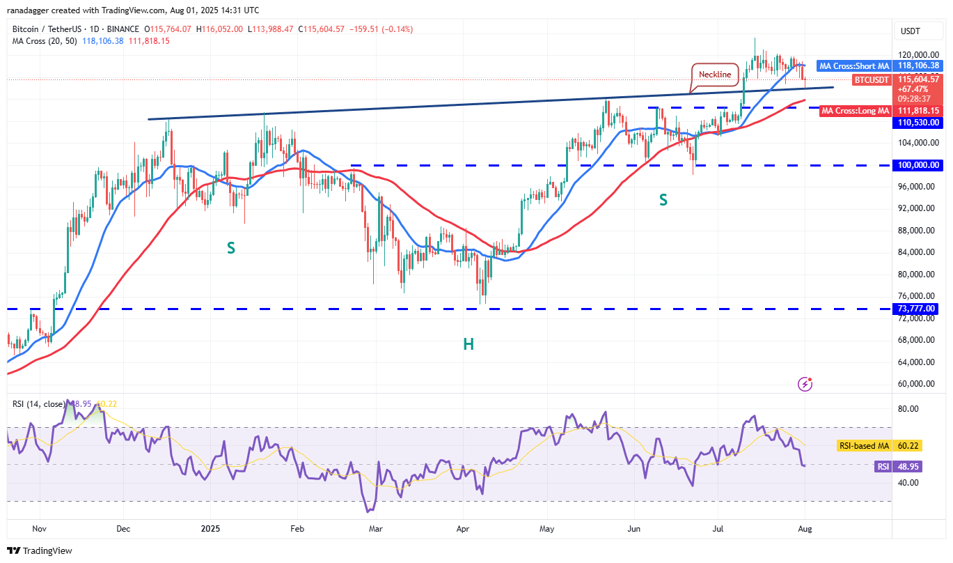 If the price rebounds off the neckline with force, it signals that the bulls are trying to flip the level into support. A break above the 20-day simple moving average ($118,106) enhances the prospects of a rally to $123,218. Sellers are expected to aggressively defend the $123,218 level, but if the buyers prevail, the BTC/USDT pair could soar to $135,000.