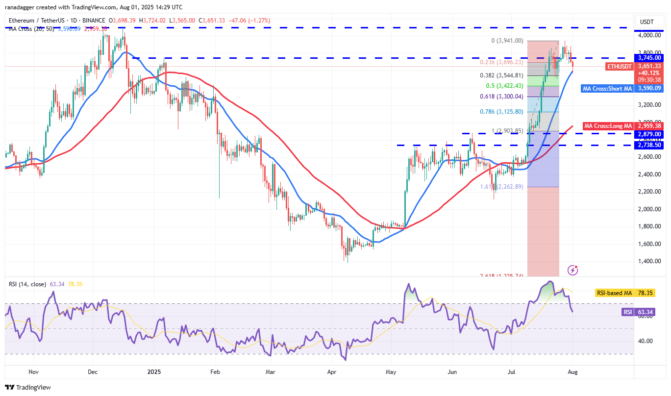 The price has reached the 20-day SMA ($3,590), which is a crucial support to watch. If the price rebounds off the 20-day SMA with strength, the bulls will attempt to shove the ETH/USDT pair above $3,941. If they can pull it off, the pair may ascend to $4,094. Sellers are expected to mount a strong defense at $4,094.