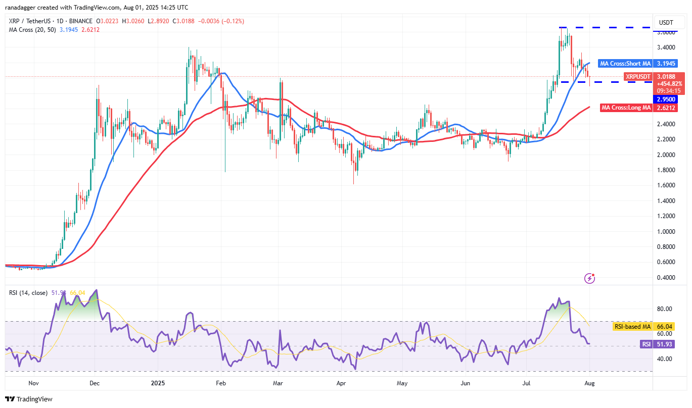 Buyers tried to push XRP (XRP) back above the 20-day SMA ($3.19) on Thursday, but the bears held their ground.