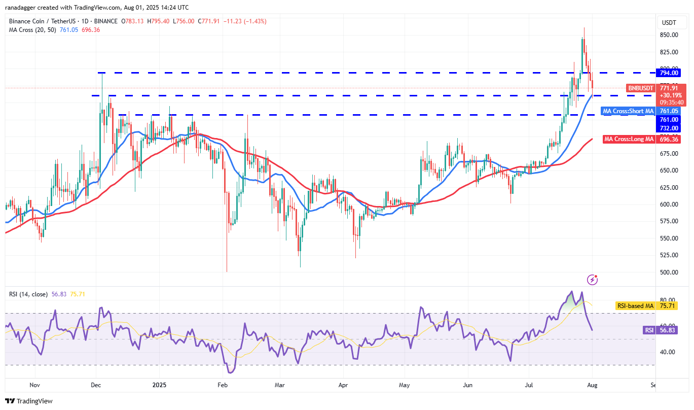 BNB (BNB) closed below the breakout level of $794 on Thursday and reached the 20-day SMA ($761) on Friday.