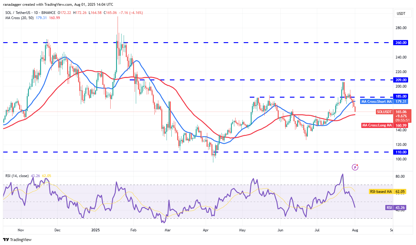 The next support on the downside is at the 50-day SMA ($161). If the price rebounds off the 50-day SMA, the bulls will try to drive the SOL/USDT pair above $185. If they succeed, the pair could rally to $209.