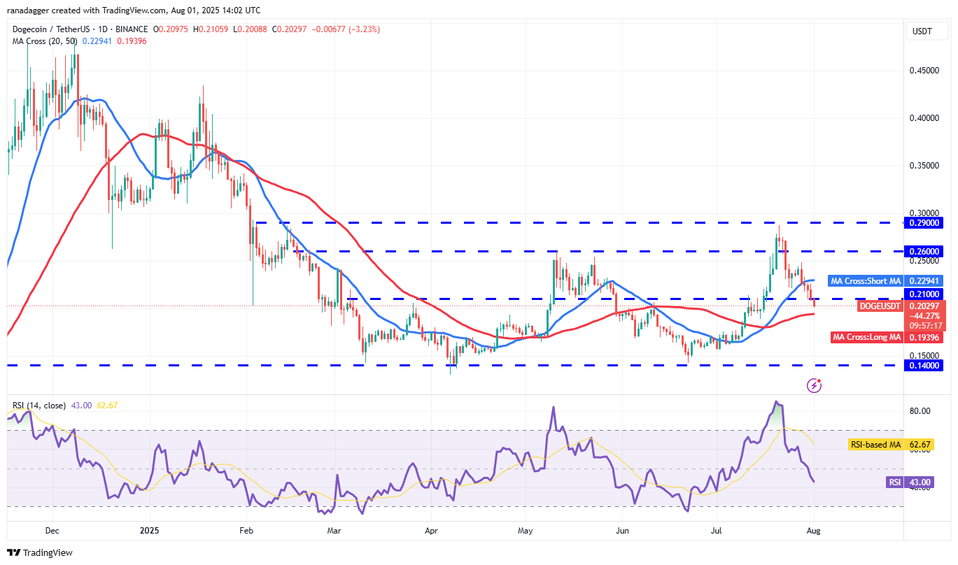 Dogecoin (DOGE) bounced off the $0.21 support on Wednesday, but the bulls could not push the price above the 20-day SMA ($0.22).