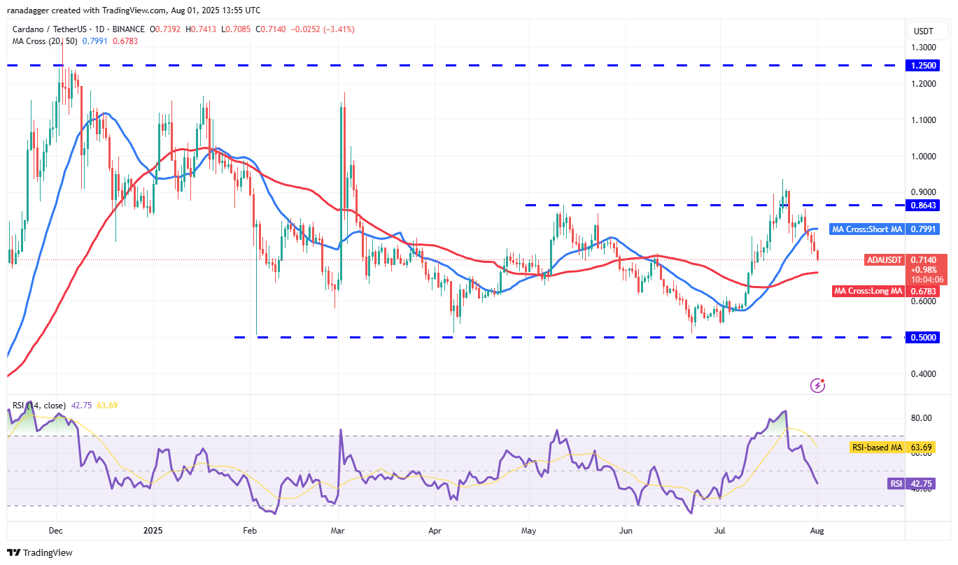 Cardano (ADA) has been gradually slipping toward the 50-day SMA ($0.67), signaling that the bulls are losing their grip.