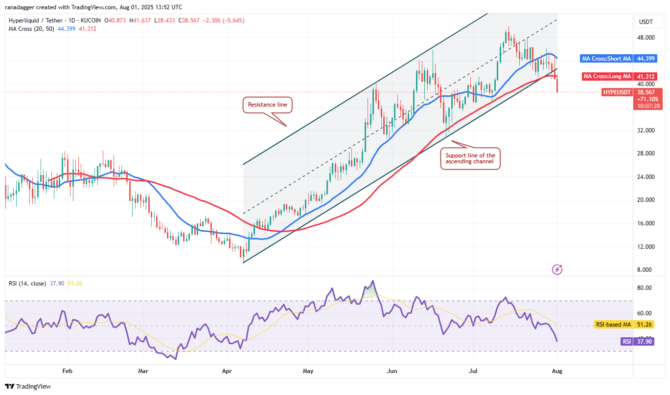 The HYPE/USDT pair could decline to $36, which is likely to act as strong support. Buyers will try to push the price back into the channel, but may face significant resistance at the breakdown level. If the price turns down from the support line, it suggests that the bears have flipped the level into resistance. That could start a deeper correction to $32.