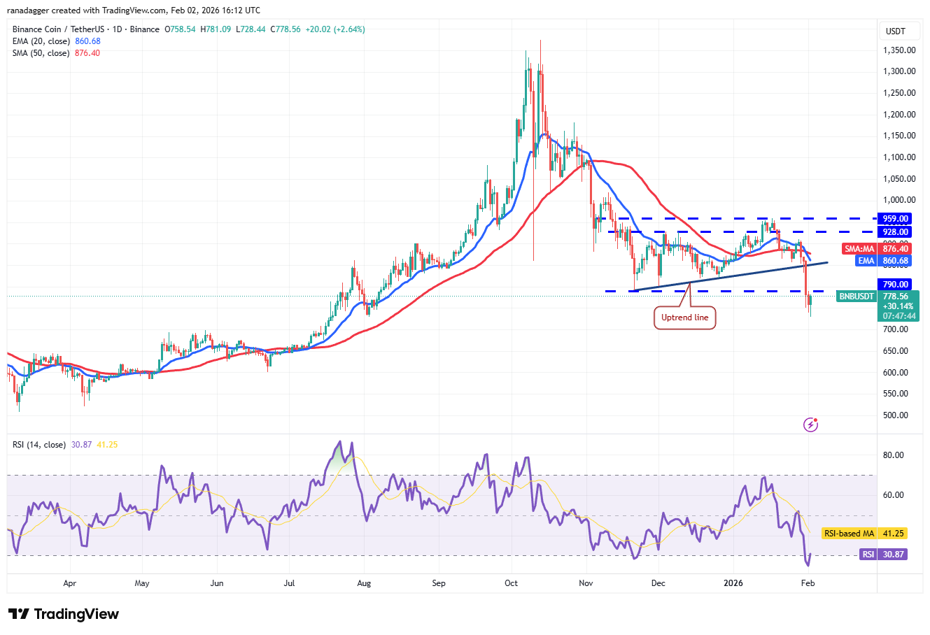 BNB (BNB) plummeted below the uptrend line and the $790 support on Saturday, indicating aggressive selling by the bears.