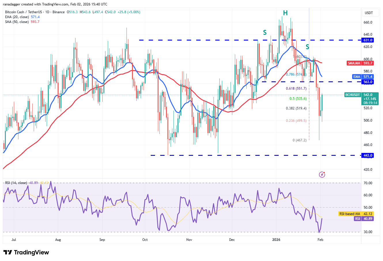 On the contrary, if buyers propel the price above $551, the pair may reach the 20-day EMA ($571). A close above the 20-day EMA signals that the bulls are back in the game.