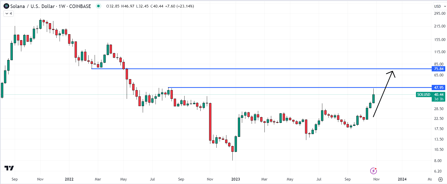 Solana’s native SOL token recently vaulted to 14-month highs above $40, and could be in for further swift gains assuming it can break above key resistance around $48.