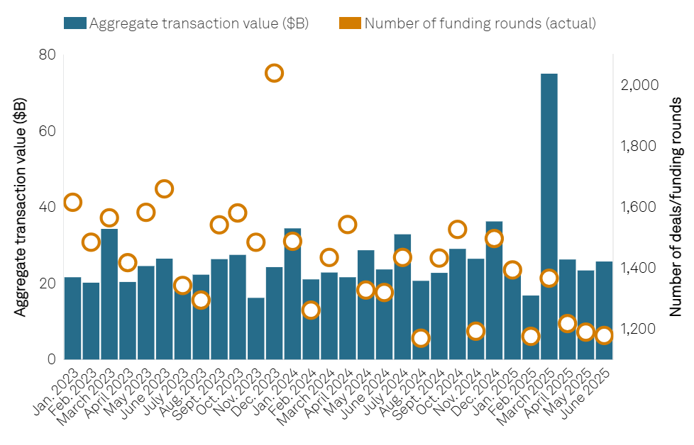 Venture capital activity has picked up in the past year, fueled partly by a surge in AI startups. Source: S&P Global