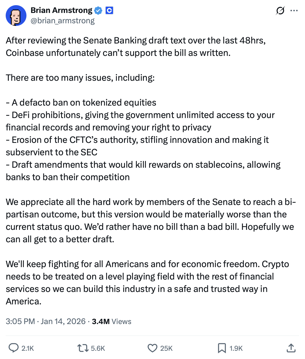 Coinbase CEO Brian Armstrong said on X that there were “too many issues” with the current draft of the bill to support it, including eliminating stablecoin yields while insulating banks from competition.