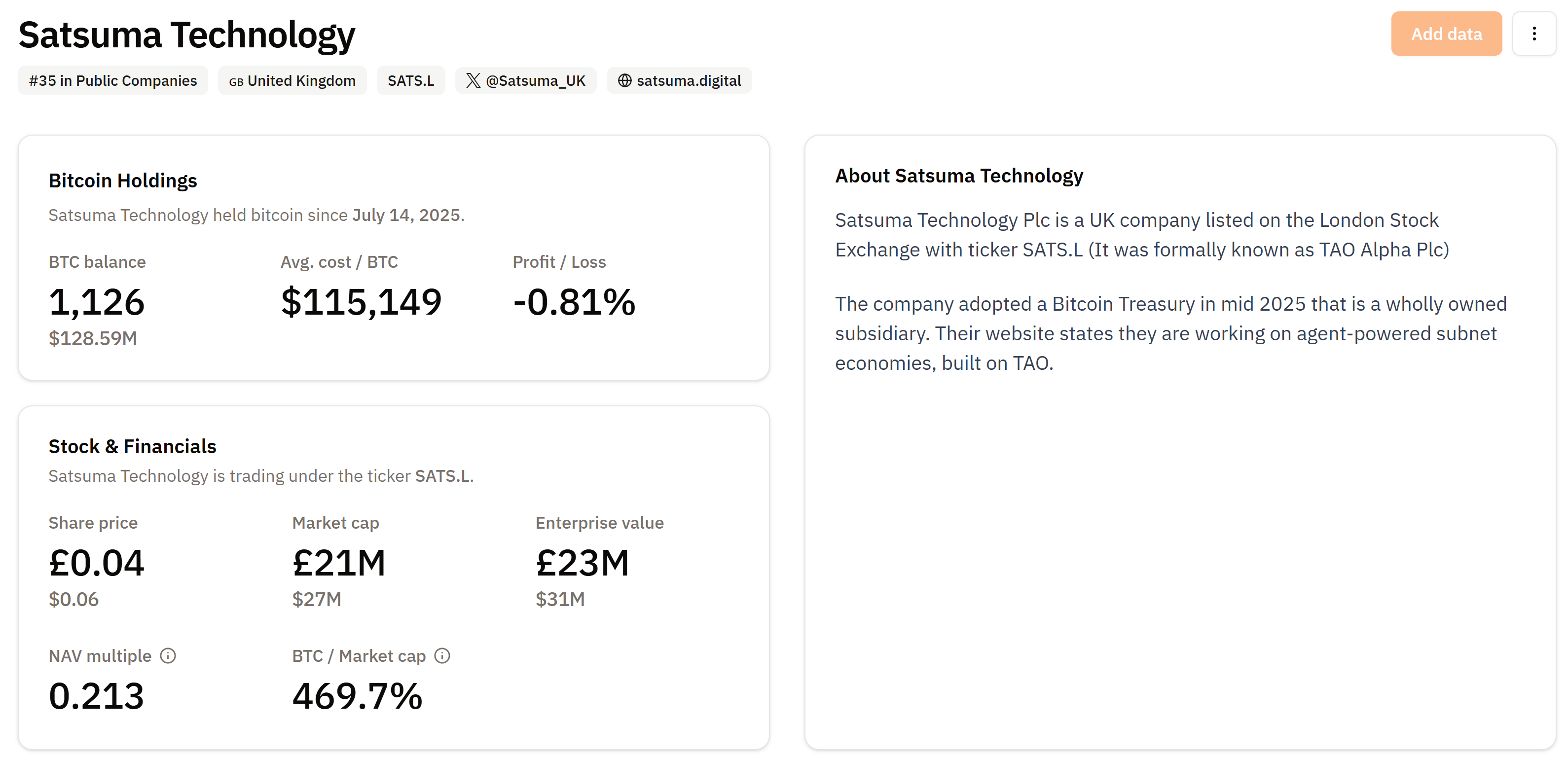 Satsuma holds 1,126 BTC. Source: BitcoinTreasuries.NET