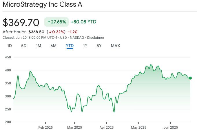Shares in MicroStrategy Inc. (MSTR) are up nearly 28% this year, having clawed back from a low of just under $238 in early April. Source: Google Finance