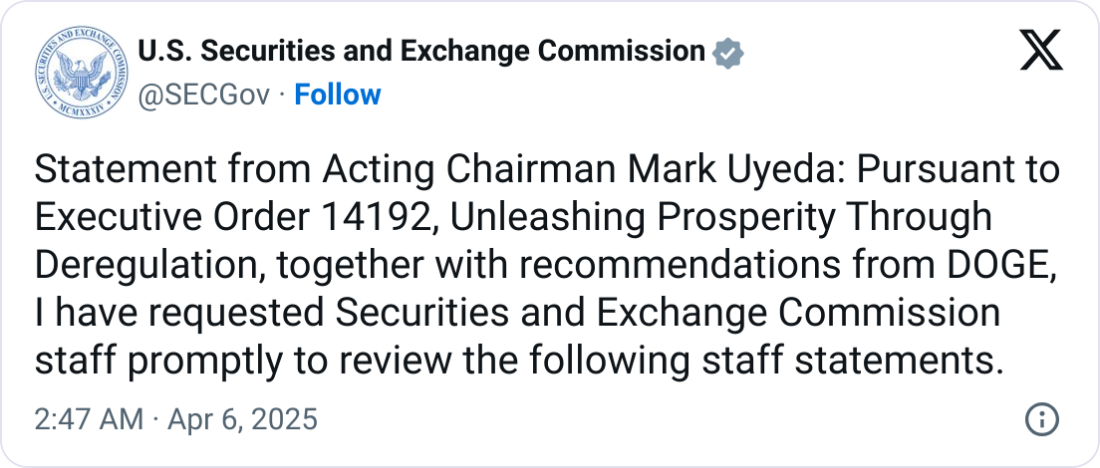 Uyeda said in an April 5 statement shared by the SEC on X that due to Trump’s executive order on deregulation and recommendations from the Elon Musk-led Department of Government Efficiency, or DOGE, he was reviewing seven staff statements, five of which concerned crypto.