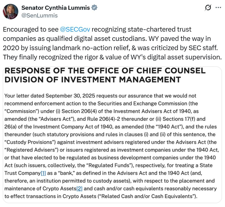 Wyoming Senator Cynthia Lummis, meanwhile, was “encouraged to see the SEC recognizing state-chartered trust companies as qualified digital asset custodians,” and also pointed out her state made a similar move in 2020, which the Biden-era SEC condemned at the time.