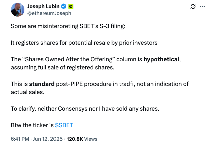 SharpLink chairman Lubin clarified that this was a routine regulatory procedure, not insider unloading.