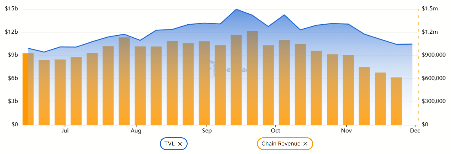 The total value locked (TVL) on the Solana network declined to $10.5 billion on Monday, a 20% drop compared with one month earlier. Blockchain revenue, measured by weekly fees, has fallen to its lowest level since May, which helps explain why SOL has lagged behind the broader altcoin market. For comparison, Ethereum’s weekly fees are down only 5% over the same 30-day period.