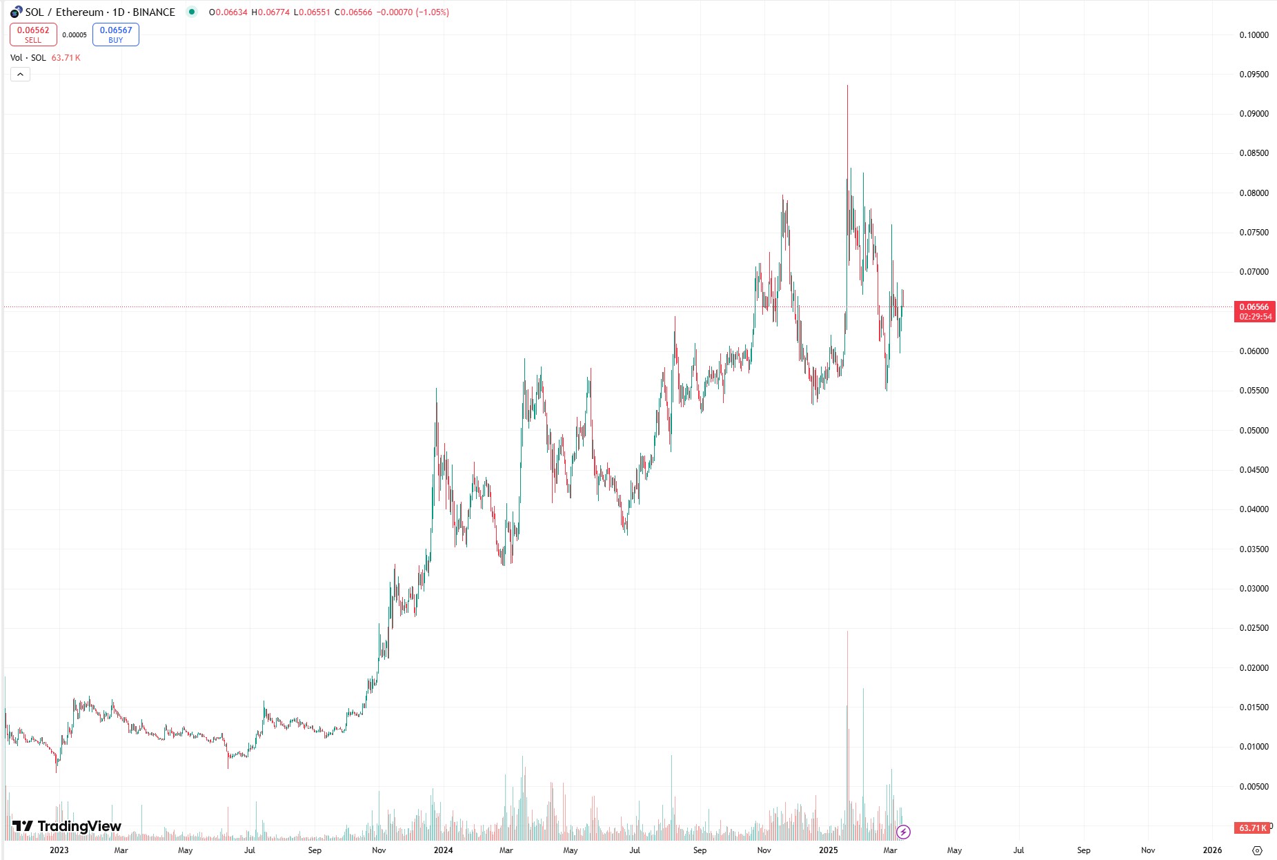 Solana’s native SOL token has performed about twice as well as Ether since early 2024, according to TradingView.